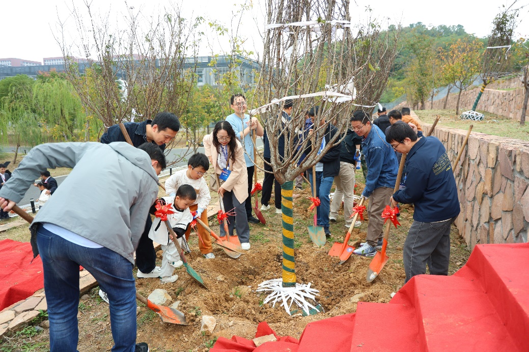 下午,员工们来到公司大楼东边的樱花林,以年级为单位,在专业人员的指导下,亲手种下一棵棵樱花树。陈延峰教授和祝名伟教授共同为员工林“旧雨新樱”揭幕。