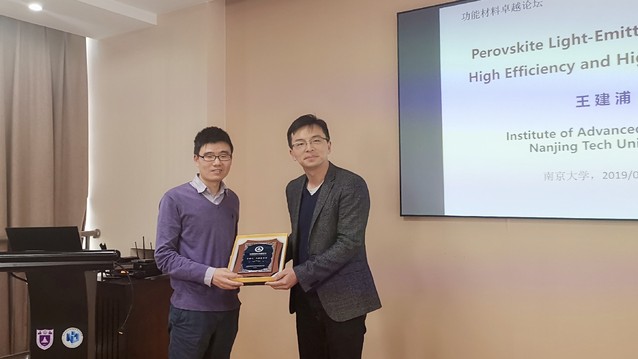 2019年4月17日下午两点,“功能材料卓越论坛”第一期第二讲在唐仲英楼B501开讲。本次论坛邀请到的嘉宾是南京工业大学先进材料研究院常务副经理王建浦教授。报告题为“钙钛矿发光二极管:高效率和高亮度”。报告由江苏省功能材料设计原理与应用技术重点实验室教授鲁振达主持,朱嘉教授代表实验室向王建浦教授赠送讲坛纪念品。吴迪,朱嘉,张伟华,邓正涛,鲁振达,谭海仁、电子公司潘力嘉等教授参加了讲座。
