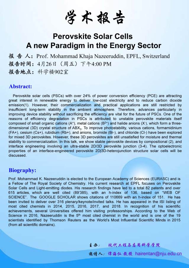 报告题目:Perovskite Solar Cells-A New Paradigm in the Energy Sector