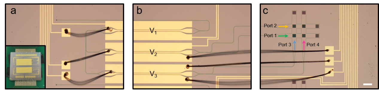 图3 超构表面-薄膜铌酸锂样品图。(a)耦合光栅区域。(b)电光开关区域。(c)超构表面网络区域。