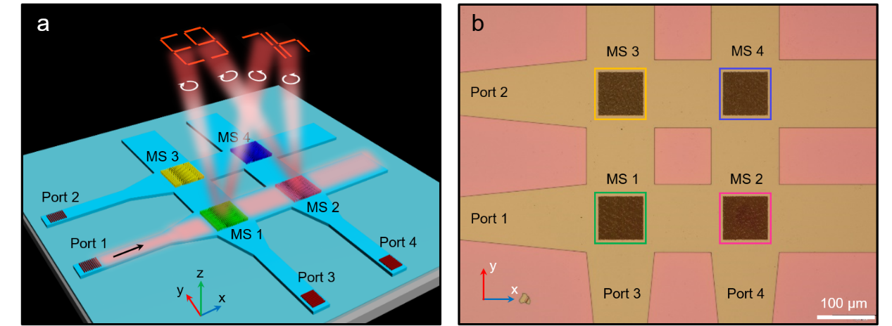 图2 片上集成超构表面网络。(a) 2×2网络结构示意图。(b)实物显微镜图。