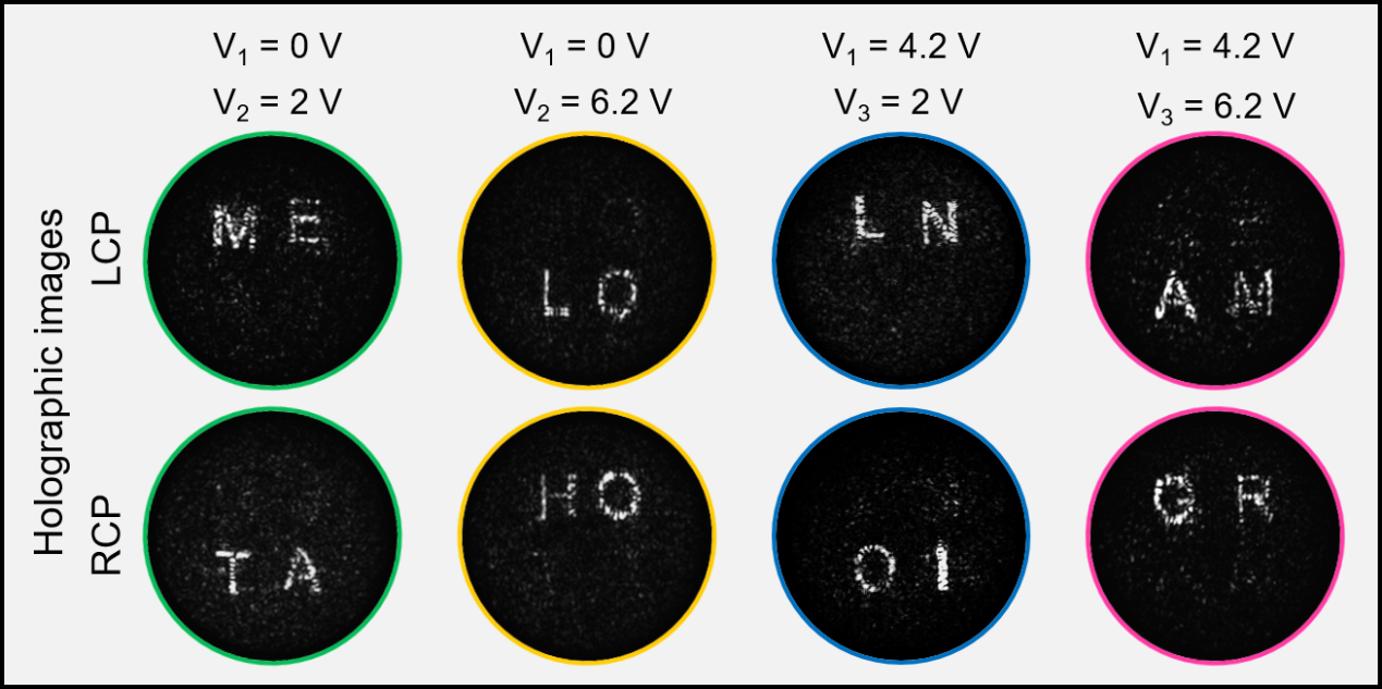 薄膜铌酸锂电光开关赋能快速动态调控。解决动态调控问题的关键在于寻找合适的材料平台。随着绝缘体上铌酸锂(LNOI)技术的迅速兴起,薄膜铌酸锂已经成为构建下一代光子集成芯片的重要平台。特别是高性能铌酸锂电光调制器的发展,为可重构的片上光场调控提供了解决方案。研究团队充分利用薄膜铌酸锂优异的电光响应特性,将片上集成超构表面网络与铌酸锂电光开关相集成(图3),完成纳秒量级的高速、集成化光场调控功能。其中,电光开关由三个铌酸锂调制器构成,它如同一个高速光路由器,能够根据施加的电压,快速将光信号精确地引导至超构表面网络的特定输入端口,完成对网络中不同单元的高速激活与切换,从而动态调用所需的全息图像。作为概念验证,研究人员通过实验展示了左右旋圆偏振状态下,八幅全息字母动态切换的效果(图4)。