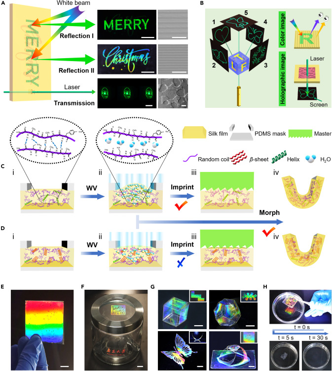 图1:丝蛋白基多功能光学成像平台的概念、机理和性能。(A、B)基于蚕丝蛋白的2D和3D光学成像平台。(C、D)无定形和结晶性丝膜的压印和3D变形机制。(E)尺寸为5×5 cm的压印光栅结构的丝膜。(F)附着于玻璃器皿的平面和曲面部位的图案化蛋白薄膜。(G)具有复杂3D结构的彩色丝膜。(H)显示二维码的无定形丝膜在水中的快速溶解。
