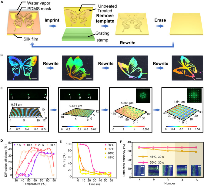 图2:基于水蒸气辅助微/纳米压印技术的光学结构的重写。(A)图案化光学结构的制备和重写示意图。(B)四种不同姿势的蝴蝶图案的连续书写。(C)不同衍射光学元件之间的可控重写。(D)丝膜衍射效率与水蒸气处理条件的关系。(E)残余衍射效率(Dr)与初始衍射效率(Di)之比与水蒸气中擦除时间的关系。(F)连续多次压印过程中丝膜衍射效率的变化。