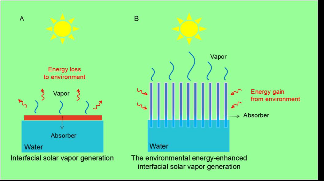 图1. 传统界面光蒸汽转化 (A) 与环境能量增强的界面光蒸汽转化(B)对比示意图