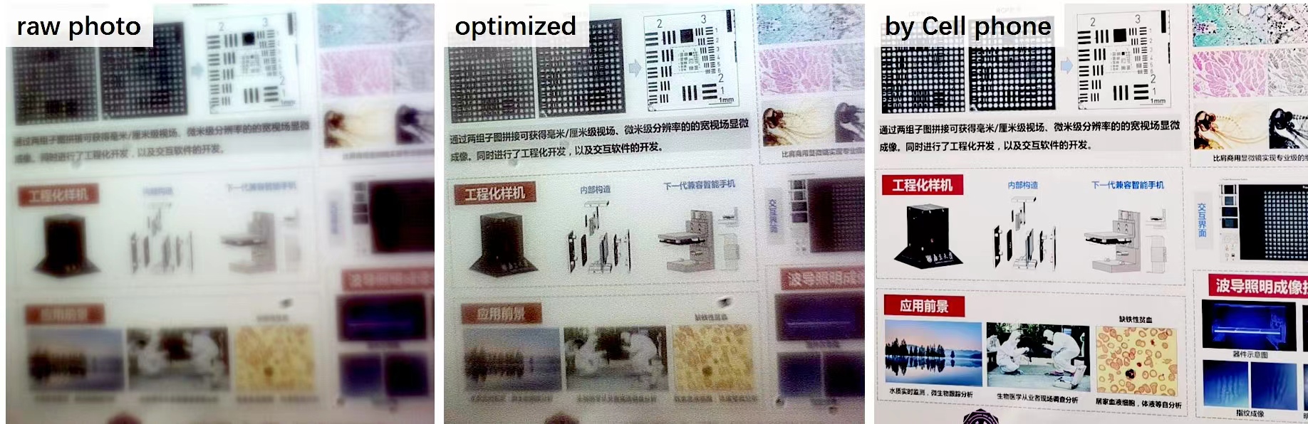 图4 同样拍摄环境下成像对比。(左)AMDL拍摄的原始图像,(中)经算法处理后的AMDL成像效果,(右)华为手机(P40)拍摄图像。