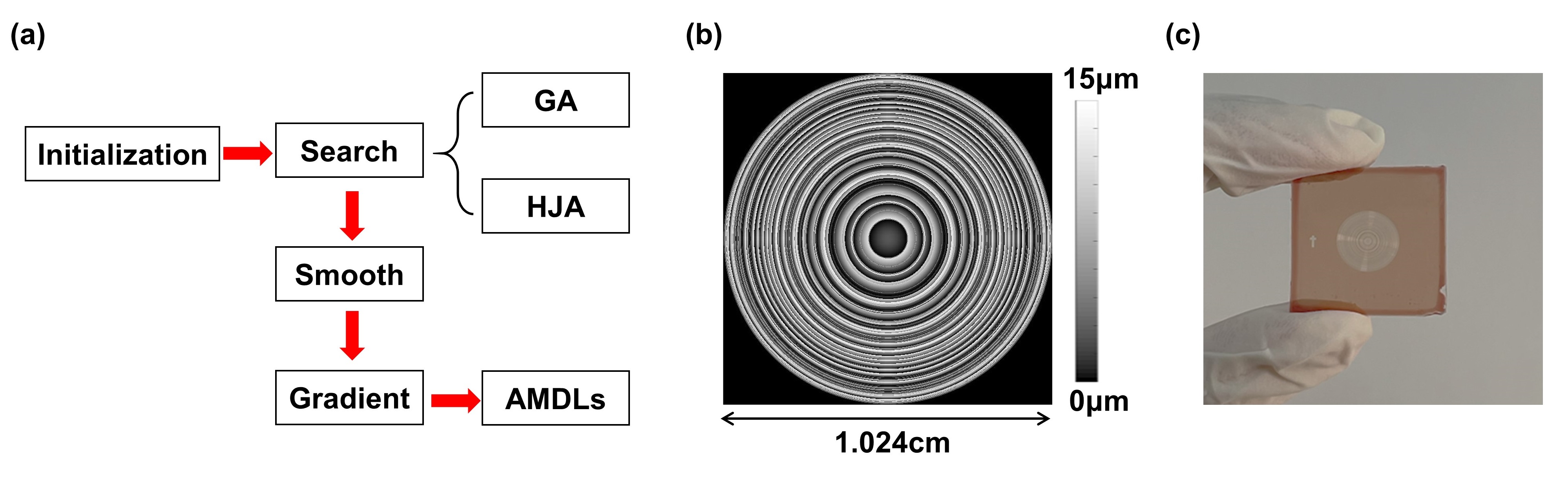 首先,研究人员考虑到影响透镜消色差成像性能的多重因素,包括成像效率、分辨率(与数值孔径相关)、成像视场(透镜口径相关)、消色差范围等,提出了一个频谱相干度的物理量,可以全面的反映一个消色差透镜的综合性能。理论分析表明,在维持一定的频谱相干度下,用15微米厚度的消色差平面透镜可以达到的1厘米左右的口径(如图1右侧所示)。与此同时,研究人员基于多阶衍射透镜的体系提出了一套完整的优化设计框架,能够有效降低衍射单元结构的深宽比,成功设计出直径1.024厘米的消色差多阶衍射透镜。接着,研究团队基于灰度曝光的光刻工艺,成功研制出该厘米口径的消色差多阶衍射透镜(AMDL),如图2所示。