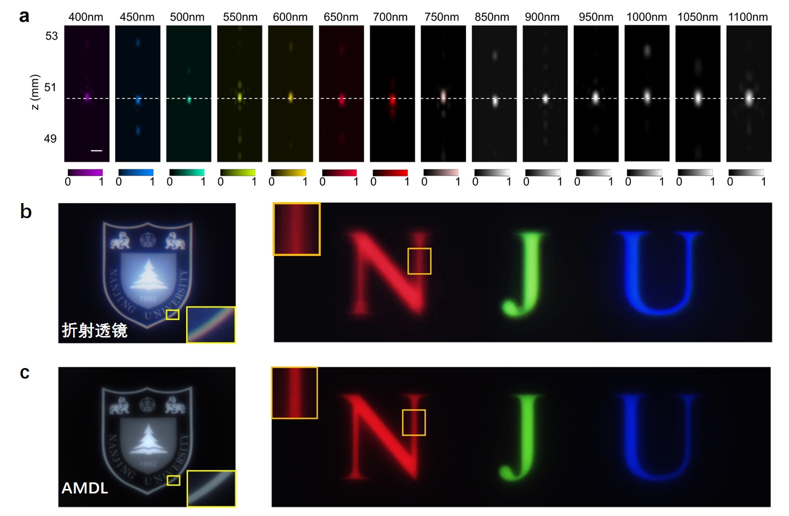 图3 (a)消色差AMDL在400-1100 nm波长范围内的消色差聚焦实验结果。(b,c)折射透镜和消色差平面透镜成像对比。左图是展示白色物体边缘的色晕对比,右图是针对蓝光物体聚焦成像时,两种透镜对红光物体成像精度对比。