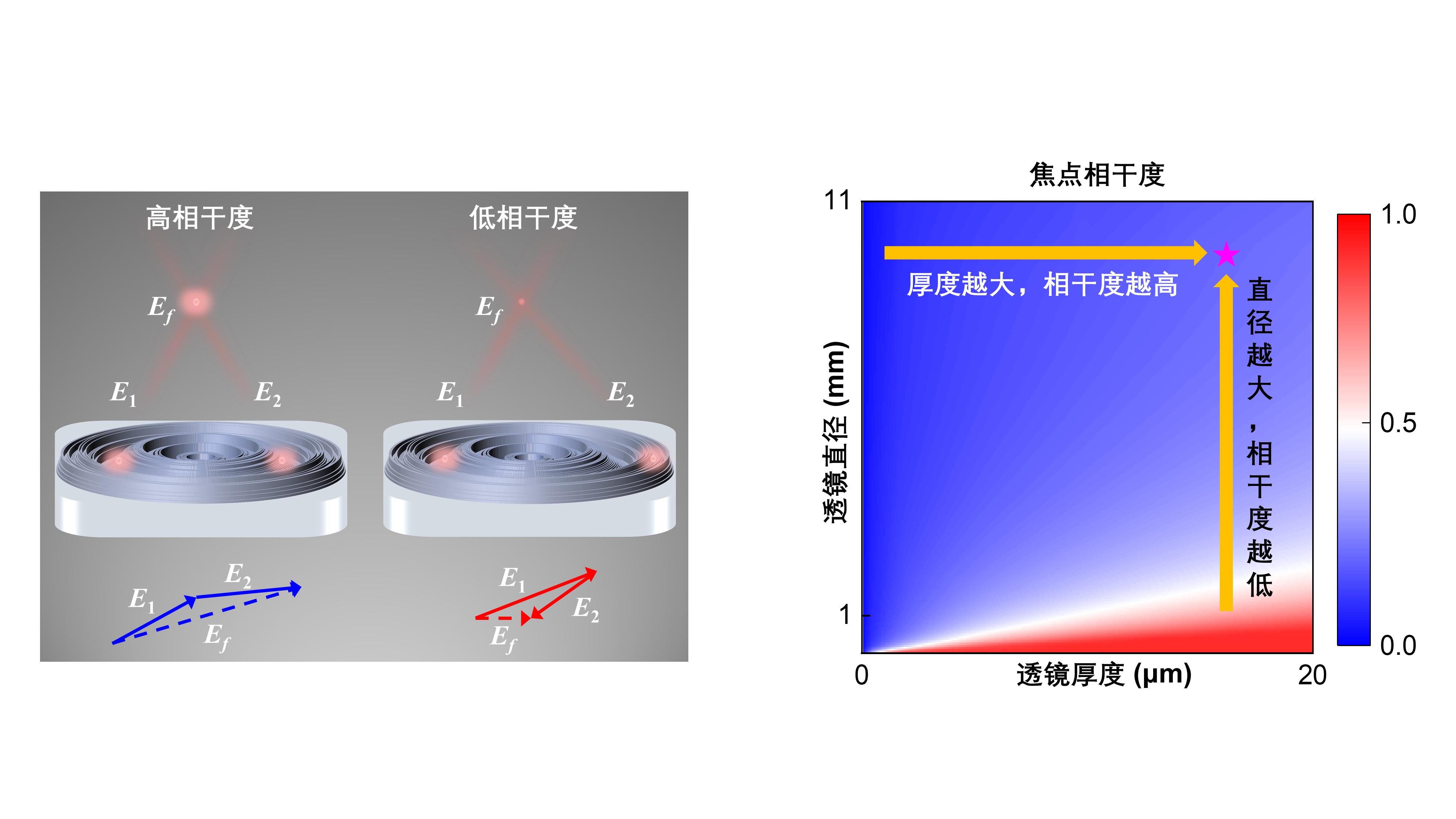 近日,太阳成集团122ccvip李涛教授、祝世宁院士研究组针对平面透镜宽带消色差成像的综合性能的表征引入一个新的参量—频谱相干度(如图1左侧所示),可有效地评估与优化宽波段下消色差平面透镜可设计的口径的理论上限。在此方法指导下,他们联合南方科技大学李贵新教授研究组成功设计并研制出口径达1厘米,且具有较高效率的消色差平面透镜,工作波长覆盖400-1100 nm。该成果发表在 Light: Science & Applications,题为Large-scale achromatic flat lens by light frequency-domain coherence optimization。太阳成集团122ccvip博士生肖行健是论文第一作者,李涛教授和南方科技大学李贵新教授为论文的通讯作者。该工作得到祝世宁院士的悉心指导。