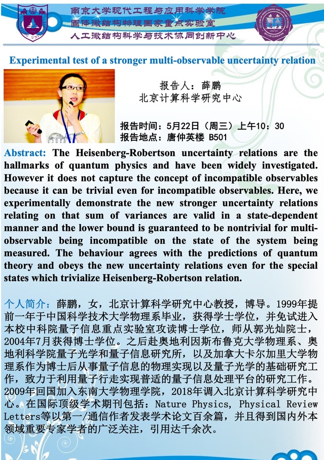 报告题目:Experimental test of a stronger multi-observable uncertainty relation