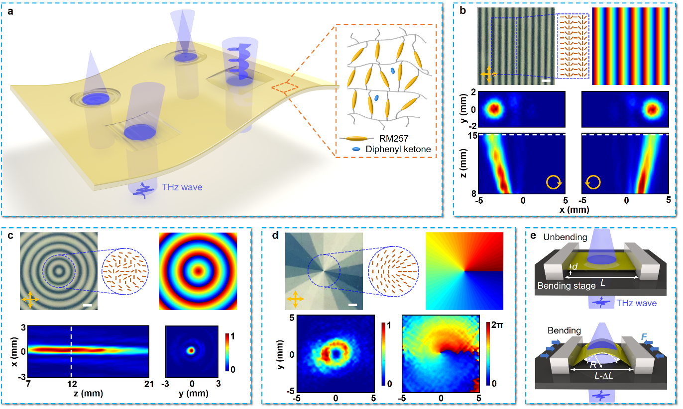 图1a,结构取向的液晶聚合物柔性膜对太赫兹波前调控示意图;b,光束偏折器;