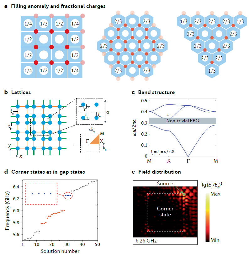 由于高阶拓扑相往往存在于具有特殊晶体空间群对称性的系统,或者需要系统具有负耦合,因此经典波系统,诸如光子晶体、声子晶体、电路系统等是实现高阶拓扑相的良好平台。同时高阶拓扑相所具有的独特的物理效应,比如多维度边界态和分数化荷等,又为实现具有特殊功能的光、声、电器件提供物理基础。