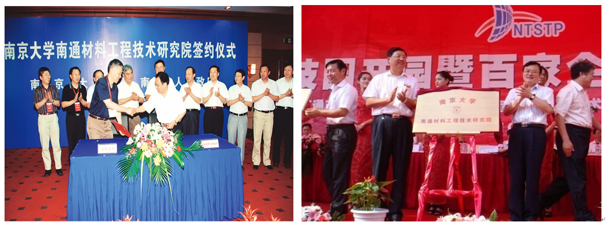 太阳成集团122ccvip南通材料工程技术研究院签约(左)与入驻南通科技园揭牌仪式(右)