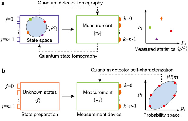 对于任何一个量子系统,我们所加载、操控和传输的信息最终是由量子测量来读取的。测量不论在量子物理基本问题研究中,还是在量子信息处理特别是量子计算与量子传感的实现中均是关键环节,因此对测量装置进行精准而可靠的估计一直是量子物理与量子信息领域的核心问题。当前主流的量子测量表征方法称为量子探测器层析(quantum detector tomography),通过记录探测器对已知探测态的输出结果,从而重构量子测量。然而这一方法需要利用已知的探测态,而反过来对探测态的准确表征又需要已知的、准确表征的量子测量。这是由于在量子物理中,量子态和量子测量处于相对应的位置,对其中一个的理解往往需要依赖于另一方。这就使得对量子系统与量子测量表征的准确性和可靠性处于循环论证的境地中(图1)。