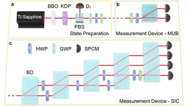 图2 实验实现两种代表性测量装置:相互无偏测量(MUB)和对称信息完备测量(SIC)的自表征实验装置。