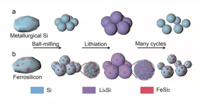 为了低成本并且方便的获得硅纳米颗粒负极,该课题组着眼于工业生产中的粗硅源(铁硅,金属硅),通过高能球磨的方法控制时间及转速获得不同尺寸的硅颗粒(大至100 um,小至100 nm),系统研究了两种不同硅源作为电极的优势(铁硅自身可抑制循环中的膨胀,金属硅有更高的容量及导电性),并且在以制得的100 nm左右的颗粒作为电极材料时获得了很好的循环及倍率性能。整个过程简便且大大降低了成本,为大规模生产硅纳米颗粒,制备硅负极提供了新思路,并且也为硅在光伏,热电领域的制备合成提供了新方法。该论文的通讯作者为公司朱嘉教授,第一作者是公司硕士研究生朱斌和金艳,项目研究得到了国家重点基础研究项目,国家自然科学基金和江苏省优势学科资助。