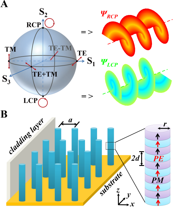 图-1 (a)光偏振庞加勒球以及左、右旋光态。(b)基于压电(PE)压磁(PM)超晶格构成的光子晶体“光拓扑绝缘体”。 ��金委项目、中组部 等基金的资助。