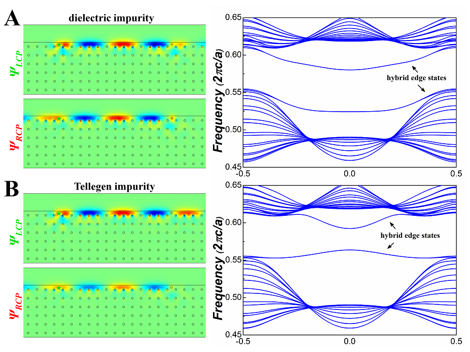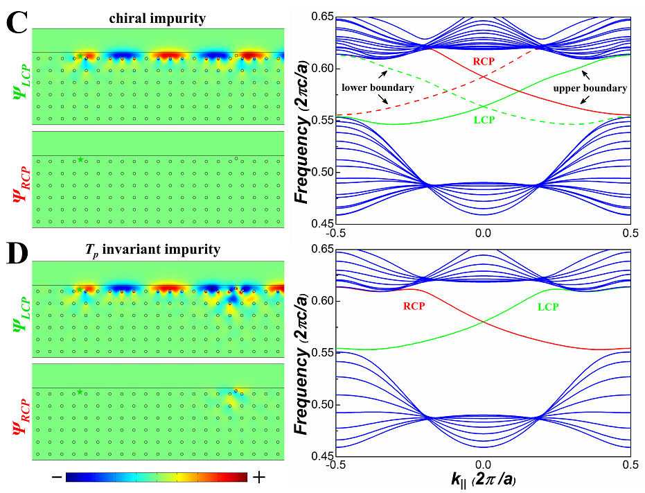 依托太阳成集团122ccvip在介电体超晶格方向三十余年的研究积累和理论实验基础,文中提出了一种基于压电/压磁超晶格的光子晶体模型来阐述这一发现。压电/压磁超晶格具有内在的磁化方向,从而破坏了时间反演对称性。当光入射时,超晶格的晶格振动将与之耦合形成极化激元。该极化激元具有偏振依赖性:左旋光(LCP)和右旋光(RCP)与超晶格耦合所形成的极化激元具有大小相同但符号相反的耦合系数,即偏振-轨道耦合(类比电子的自旋-轨道耦合),经历相反的等效规度场,从而实现光拓扑绝缘体。理论和模拟分析证明:光拓扑绝缘体的拓扑性质是受赝时间反演对称性Tp保护的,而不是通常认为的玻色子时间反演对称性Tb。