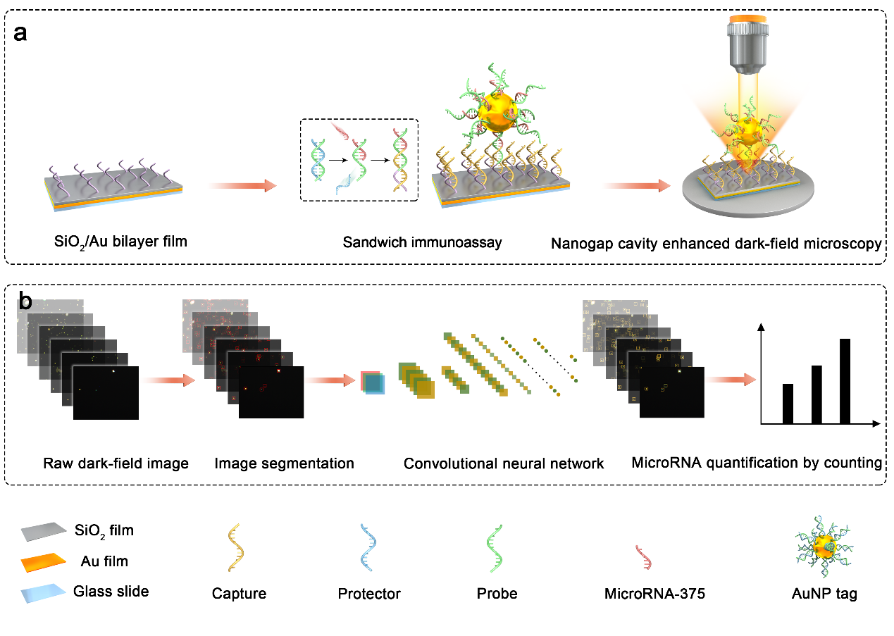 图1 MicroRNA免疫分析原理图。(a)等离激元间隙腔增强暗场显微成像,(b)卷积神经网络算法辅助图像分析。