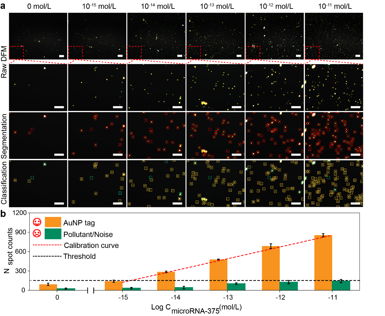 图2 MicroRNA-375分子的定量分析结果。(a)不同浓度microRNA-375对应的暗场显微图像及图像处理过程,(b)不同浓度microRNA-375对应的两类散射亮点的数目统计图。