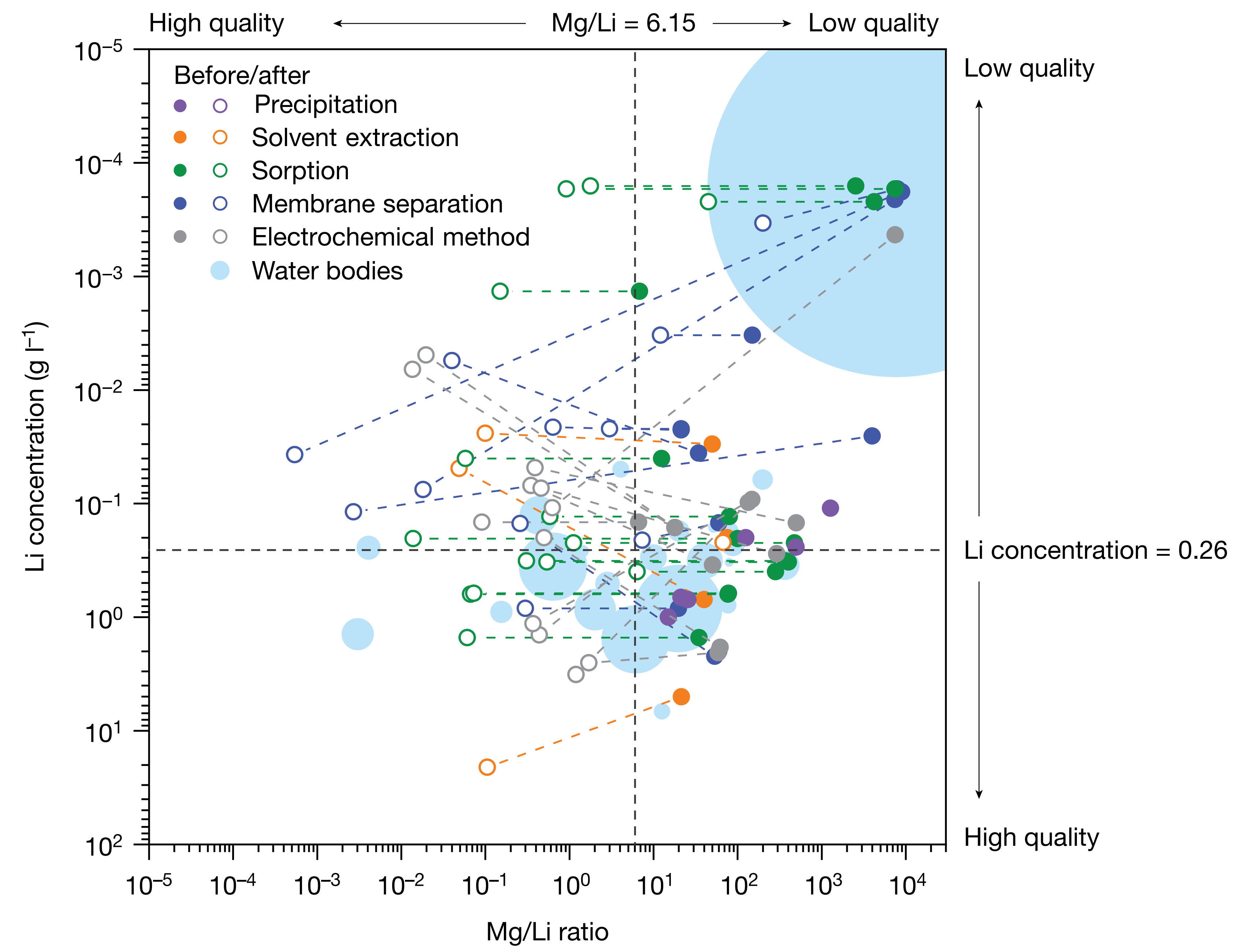 通过对全球主要水体锂资源开发情况的公开数据进行调研分析,该团队从水体开采程度和所用技术的角度提出了“低品质卤水”这一概念,即锂浓度低于0.26 g/l,或镁锂比(Mg/Li)高于6.15的卤水资源,通常包括海水、沉积水、地热流体、油田产出水和某些盐湖卤水等。这些卤水虽然锂含量较低,但其总储量巨大,并且在全球范围内分布广泛。因此,这些资源被认为是未来应对锂短缺、补充锂供给的潜在来源。