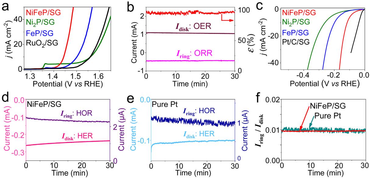 图2 (a)NiFeP/SG的OER的极化曲线,(b)RRDE技术测试的样品NiFeP/SG的OER法拉第效率,(c)NiFeP/SG的HER极化曲线,(d-f)RRDE技术对样品NiFeP/SG进行HER法拉第效率的测试