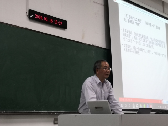 刘相平教授从习近平总书记对台工作的情怀与方略讲起,并具体分析当前台湾形势变化、台湾当前的大陆政策等。他表示台湾问题的产生和演变同中华民族命运休戚相关,并强调随着中华民族伟大复兴的到来,国家统一是中华民族伟大复兴应有之义,和平统一最符合包括台湾同胞在内的中华民族的整体利益。