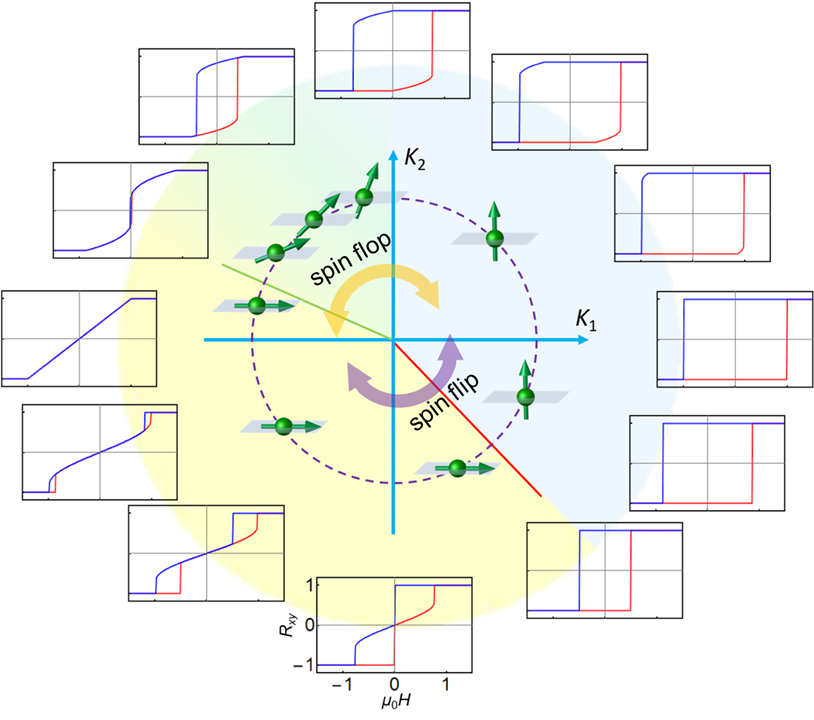 图1. 不同易磁化轴朝向对应的反常霍尔效应的磁滞回线的形状。可以看到,当沿样品面外方向施加磁场,样品的易磁化轴处于面内或者面外时,磁滞回线的形状会表现明显差异。利用二阶Stoner–Wohlfarth模型,材料的磁各向异性可以用K1和K2两个系数表达,其中系数K1描述面内和面外磁化的能量差异,系数K2描述面内和面外磁化转向之间的能垒高度。因此这两个系数共同决定了材料的能量随磁化方向的变化情形,并可以根据总能量的极小值确定出易磁化轴的朝向。使用极图展示的形式可以定量地表现出K1和K2的数值与定性的易磁化轴方向之间的对应关系,可以看到在K1–K2极图中,材料的易磁化轴朝向被划分为三个区域,蓝色区域表示面外易磁化情形,黄色区域面内易磁化情形,而位于左上角的绿色区域则是面内和面外的过渡区域,对应易磁化轴倾斜的朝向。因此,当材料的易磁化轴被调控时,从面外转到面内的路径有两种可能:一种是从原点的上方经由自旋转向(spin flop)的路径,易磁化轴方向从面内面外相互连续地翻转,另一种则是从原点的下方经由自旋反转(spin flip)的路径,易磁化轴方向在面内面外之间阶跃式地跳转。