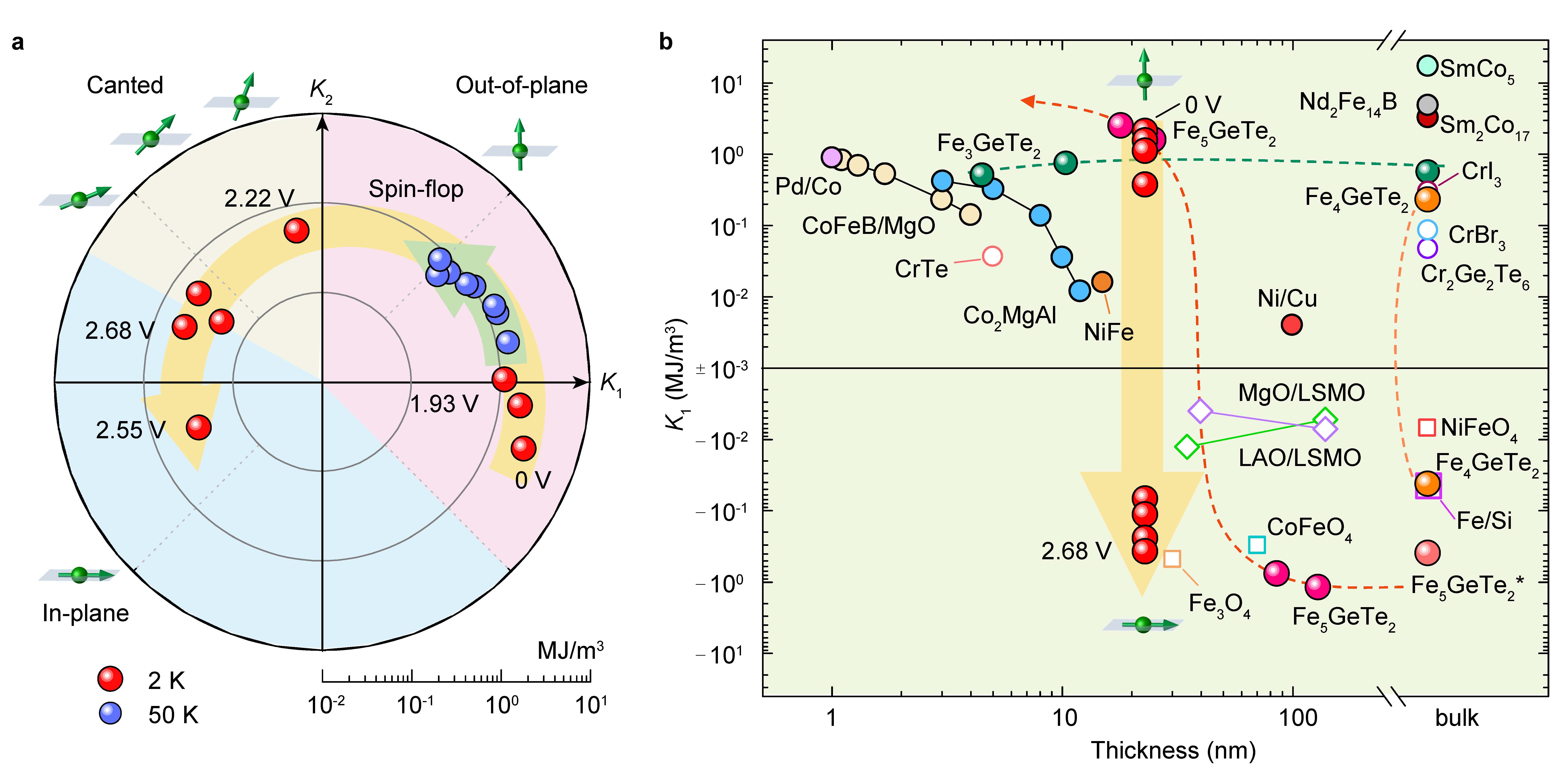 图3. 电场调控的Fe5GeTe2的易磁化轴、以及其磁各向异性系数与其它磁性材料的对比。(a)一阶和二阶磁各向异性系数K1和K2,即易磁化轴方向随栅压连续的调控。通过施加外加电场,对Fe5GeTe2的磁性进行调控,结合对其磁各向异性能的定量解析,最终实现易磁化轴的连续可控转向,使之从初始的面外方向转变到倾斜方向、并最终转变到面内方向。(b)不同磁性材料的磁各向异性系数K1的厚度依赖特性,其中红色为23 nm厚的Fe5GeTe2栅压调控的结果。值得注意的是,Fe5GeTe2的磁各向异性能不仅远超其它3d电子磁性材料,甚至接近典型的4f电子强磁材料(比如钕铁硼强磁体等),而且还可以被大范围调制,为深入理解电控磁性和易磁化轴转向的物理机制提供了范例,同时也为磁性开关器件和自旋电子学器件的应用提供了物质基础。