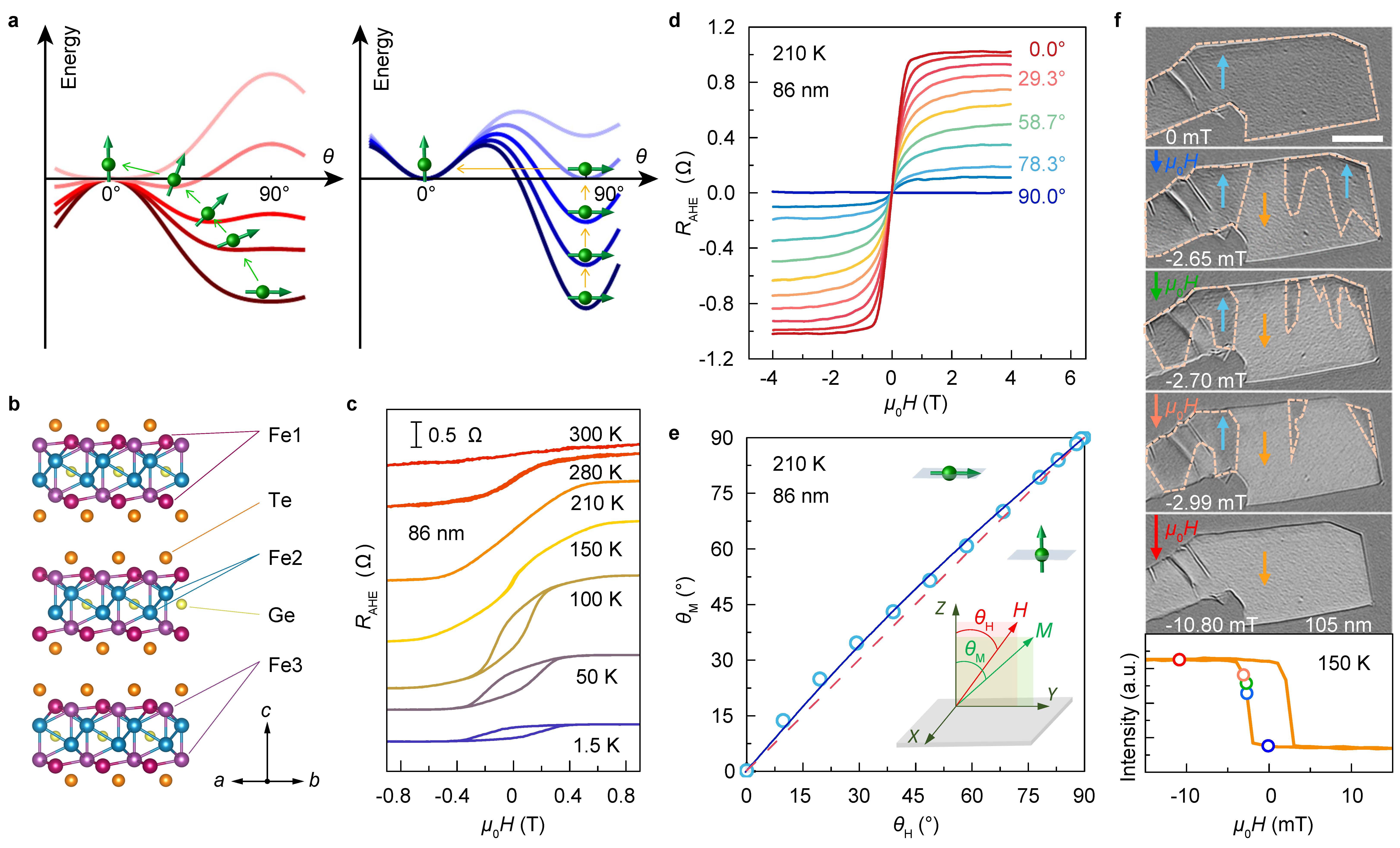 图2. 自旋反转 (spin flip)和自旋转向(spin flop)的示意图,以及层状铁磁材料Fe5GeTe2中的反常霍尔效应和磁畴演化。(a)磁性材料中易磁化轴的两种转变方式与去自旋态的自由能极小值的演化对应关系。(b)晶体结构示意图。(c)变温反常霍尔效应。(d)转角反常霍尔效应。(e)磁化方向随外加磁场方向的演化关系。(f)不同面内磁场下的磁畴成像及磁滞回线。