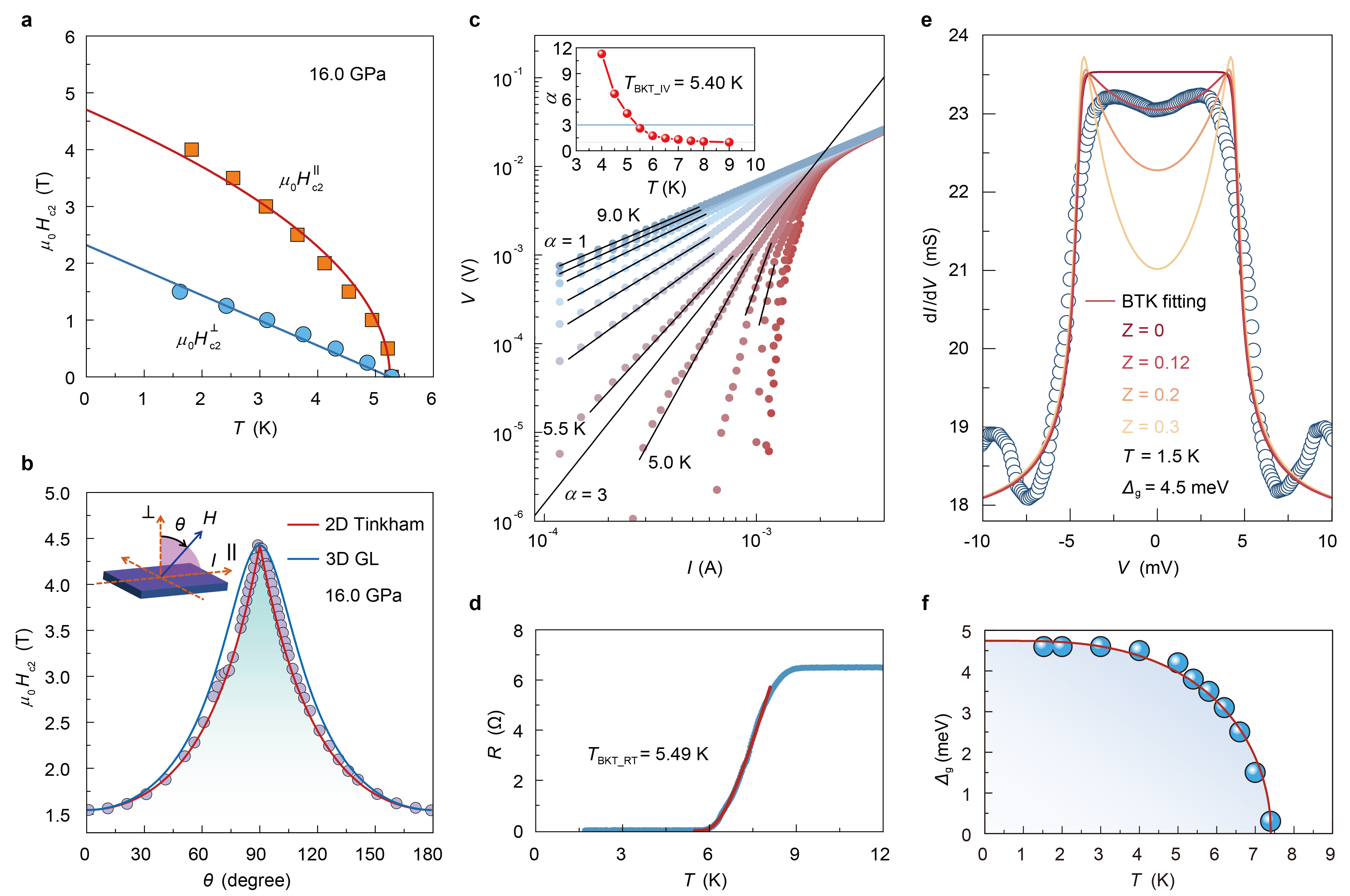 图3.加压下GeP薄层样品中的准二维超导电性和安德烈夫(Andreev)反射谱。(a)面间和面内上临界磁场的温度依赖性。(b)上临界磁场角度依赖性。(c)变温电流–电压曲线的BKT转变分析。(d)超导转变电阻曲线的BKT拟合。(e)基于GeP/石墨异质结的高压Andreev反射。(f)超导能隙的温度依赖性。