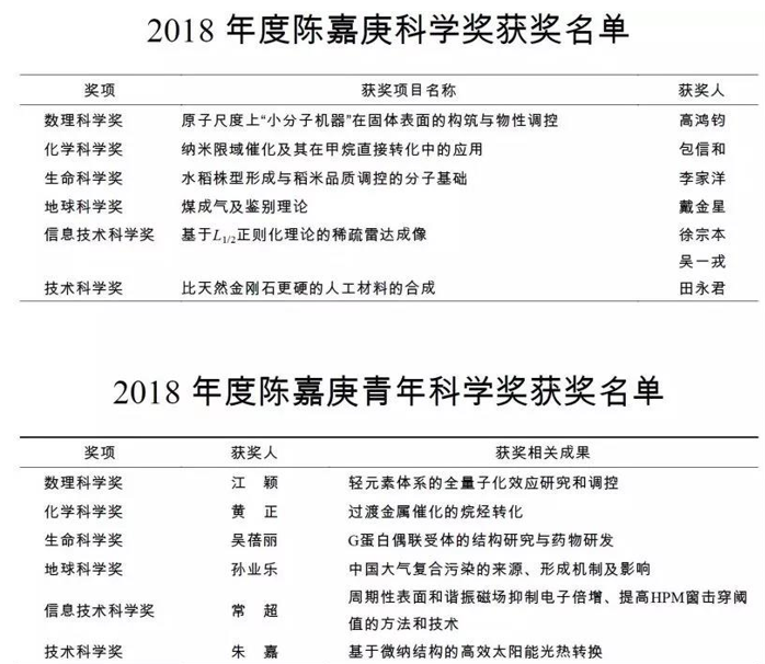 2018年度陈嘉庚科学奖和陈嘉庚青年科学奖获奖名单