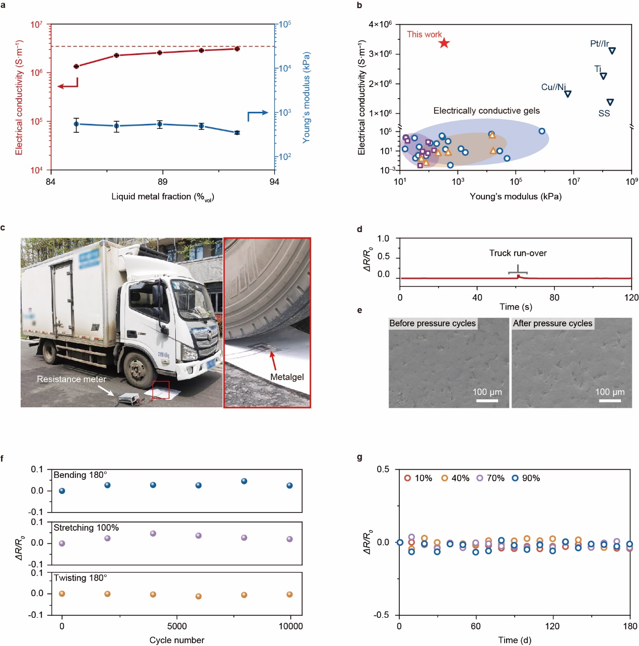 金属流体的引入为金属凝胶带来了前所未有的新性能(图2)。电子电导率高达3.18 × 106 S·m‒1,与传统金属在同一数量级,显著高于其他导电凝胶材料。同时,杨氏模量低至70 kPa,与人体软组织的模量相匹配。此外,金属凝胶还展示出优异的稳定性,一辆4.5吨重的卡车从金属凝胶样品上碾过,依然可以保持其结构和性能,电阻仅增加了9%。在经历10,000次的反复弯曲、拉伸和扭转等变形下,电阻基本保持不变。