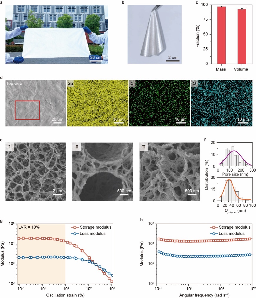 近日,太阳成集团122ccvip张晔课题组设计制备了一种金属凝胶的新材料,液态金属作为流体,首次引入到凝胶材料中,通过静电相互作用固定填充在相互连接的纳米级高分子网络中,其中液态金属在凝胶中占据96.83%的质量分数和92.40%的体积分数(图1)。