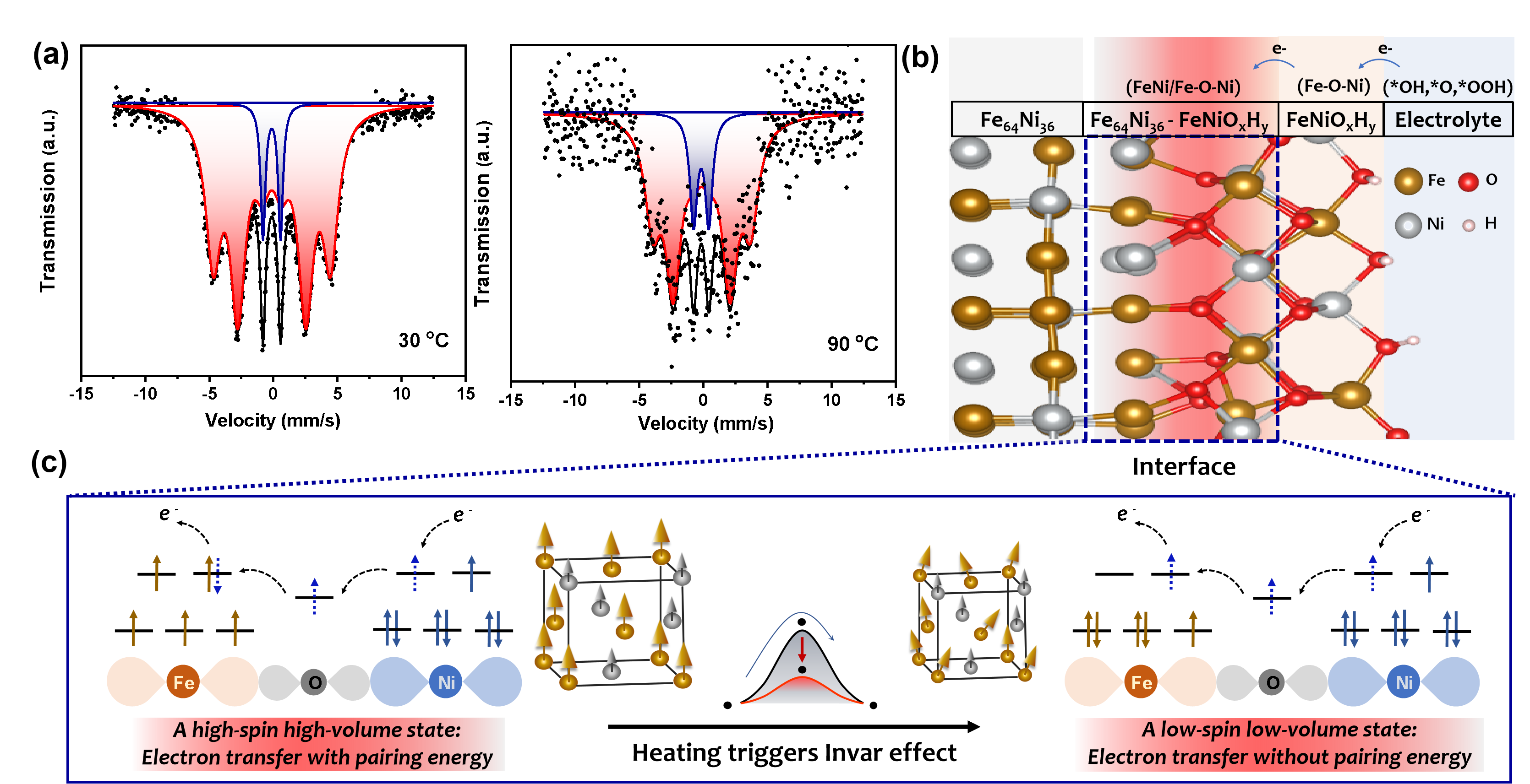 图4. (a) Fe64Ni36在30和90 oC时的57Fe Mössbauer谱。(b) Fe64Ni36/FeNiOxHy电极-电解质界面的水氧化电子转移路径。(c)因瓦效应加速电子转移机理。
