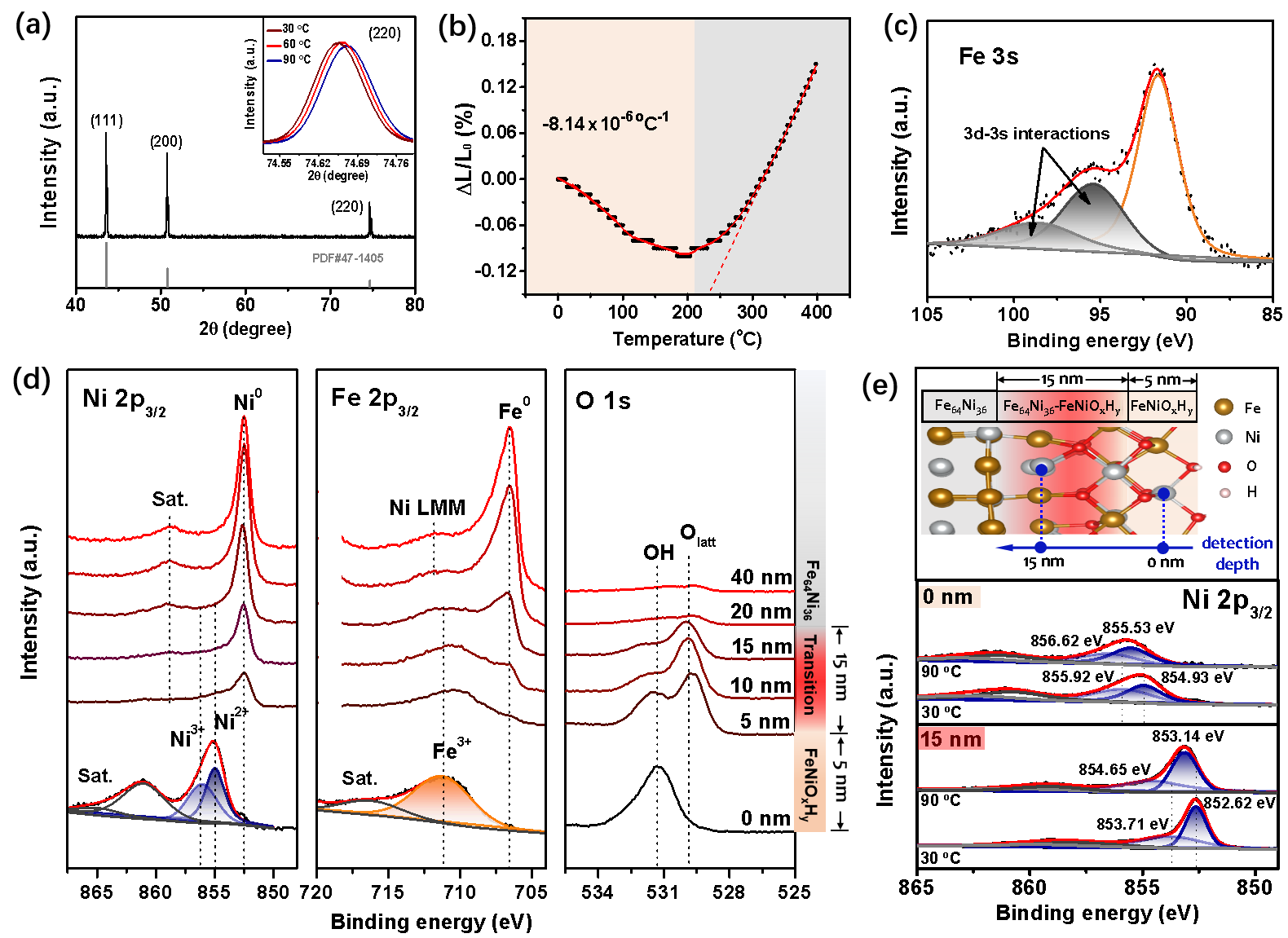 图2. (a) Fe64Ni36的XRD图。插图显示了温度依赖的(220)晶格收缩。(b) Fe64Ni36的线性热膨胀ΔL/L0。(c) Fe64Ni36的Fe 3s XPS谱。(d) Fe64Ni36/FeNiOxHy的Ni 2p、Fe 2p和O 1s的XPS深度剖析谱。(e) Fe64Ni36/FeNiOxHy的0 nm和15 nm深度处30oC和90 oC时的Ni 2p XPS谱。