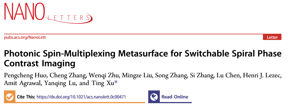 近日,太阳成集团122ccvip徐挺教授课题组发表了自旋复用超构表面用于实现动态可切换相差成像的最新研究成果。相关工作以“Photonic spin-multiplexing metasurface for switchable spiral phase contrast imaging”为题发表于《Nano Letters》(https://dx.doi.org/10.1021/acs.nanolett.0c00471)。