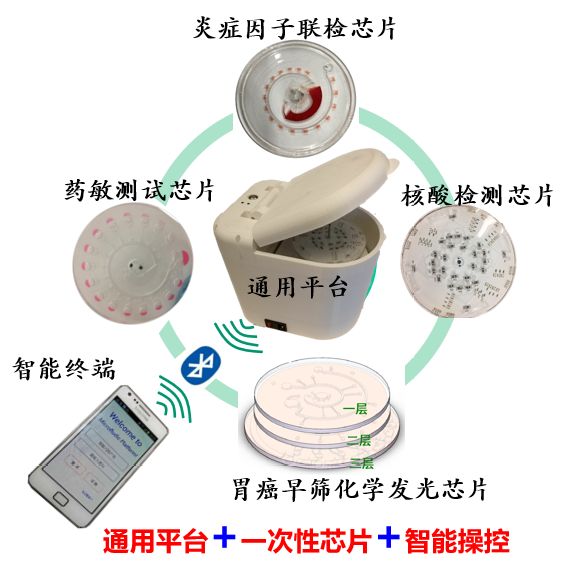 针对离心力驱动的Lab-on-a-Disc技术,课题组首次提出了“多态”及“有源”离心力微流控芯片的概念,及先进的流体芯片设计与封装技术,使得在芯片上可以实现更复杂的逻辑结构和功能操控,相关文章应邀在《Lab on a chip》封面上发表。最终实现了把样品前处理、核酸提取及核酸扩增检测等过程集成到一个光盘大小的流体芯片上,可以应用于“样品进、结果出”的即时检测(POCT)场景,并开展了病毒核酸检测、药敏检测、验证因子检测及胃癌标志物的检测等芯片研制。