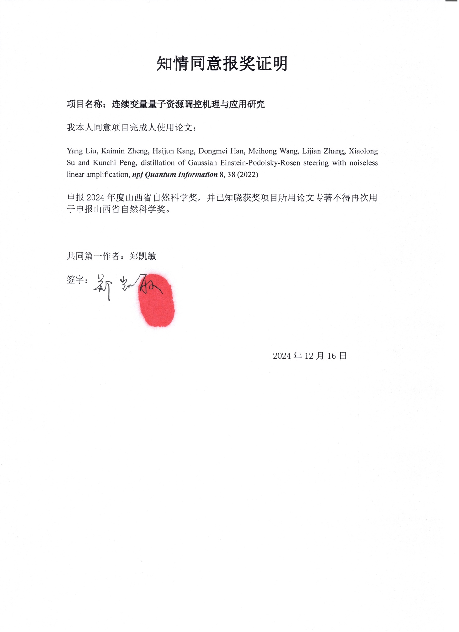 (4) Yang Liu, Kaimin Zheng, Haijun Kang, Dongmei Han, Meihong Wang, Lijian Zhang, Xiaolong Su and Kunchi Peng, Distillation of Gaussian Einstein-Podolsky-Rosen steering with noiseless linear amplification, npj Quantum Information 8, 38 (2022).