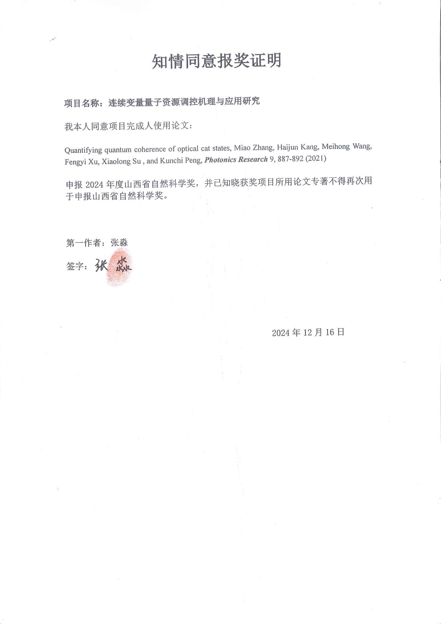 (2) Miao Zhang, Haijun Kang, Meihong Wang, Fengyi Xu, Xiaolong Su , and Kunchi Peng, Quantifying quantum coherence of optical cat states, Photonics Research 9, 887-892 (2021).