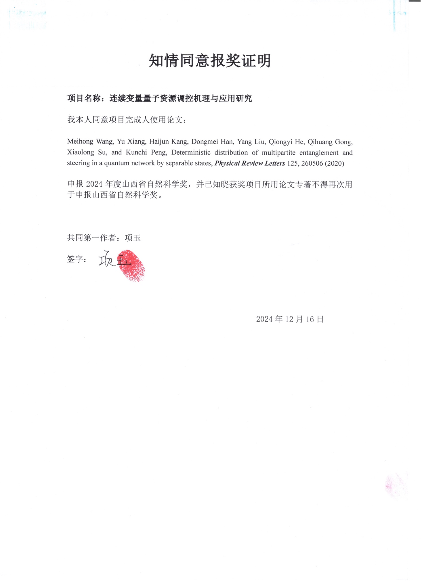 (1) Meihong Wang, Yu Xiang, Haijun Kang, Dongmei Han, Yang Liu, Qiongyi He, Qihuang Gong, Xiaolong Su, and Kunchi Peng, Deterministic distribution of multipartite entanglement and steering in a quantum network by separable states, Phys. Rev. Lett. 125, 260506 (2020).