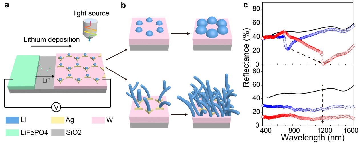 图一:原位等离激元探测金属锂沉积过程:a,原位探测的装置示意图(包括平面电池结构,反射光谱测试),b,锂金属沉积过程的两种形貌演化:周期性锂颗粒阵列的生长(上图)和无序锂枝晶的形成(下图),c,对应两种形貌演变的反射光谱:周期性锂颗粒沉积(上图)和无序锂枝晶的形成(下图)。