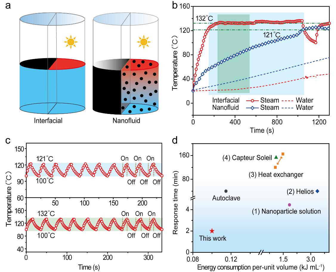 在这些远离电网的地区,太阳能资源往往十分丰富,因此近些年来,太阳能驱动的蒸汽灭菌技术引起广泛的关注。如图1a所示,蒸汽灭菌包括三个阶段,即:升温阶段(蒸汽温度升高到灭菌温度),保温阶段(蒸汽温度越高,时间越短)以及降温阶段(蒸汽温度降低到100℃,以安全打开灭菌器)。然而之前的太阳能灭菌技术多数基于体块加热方式(即加热全部的水体)来产生高温蒸汽。这种加热策略使得升温过程及降温过程都耗时很长,能量利用率低,极大限制了这种技术的实际推广和应用。