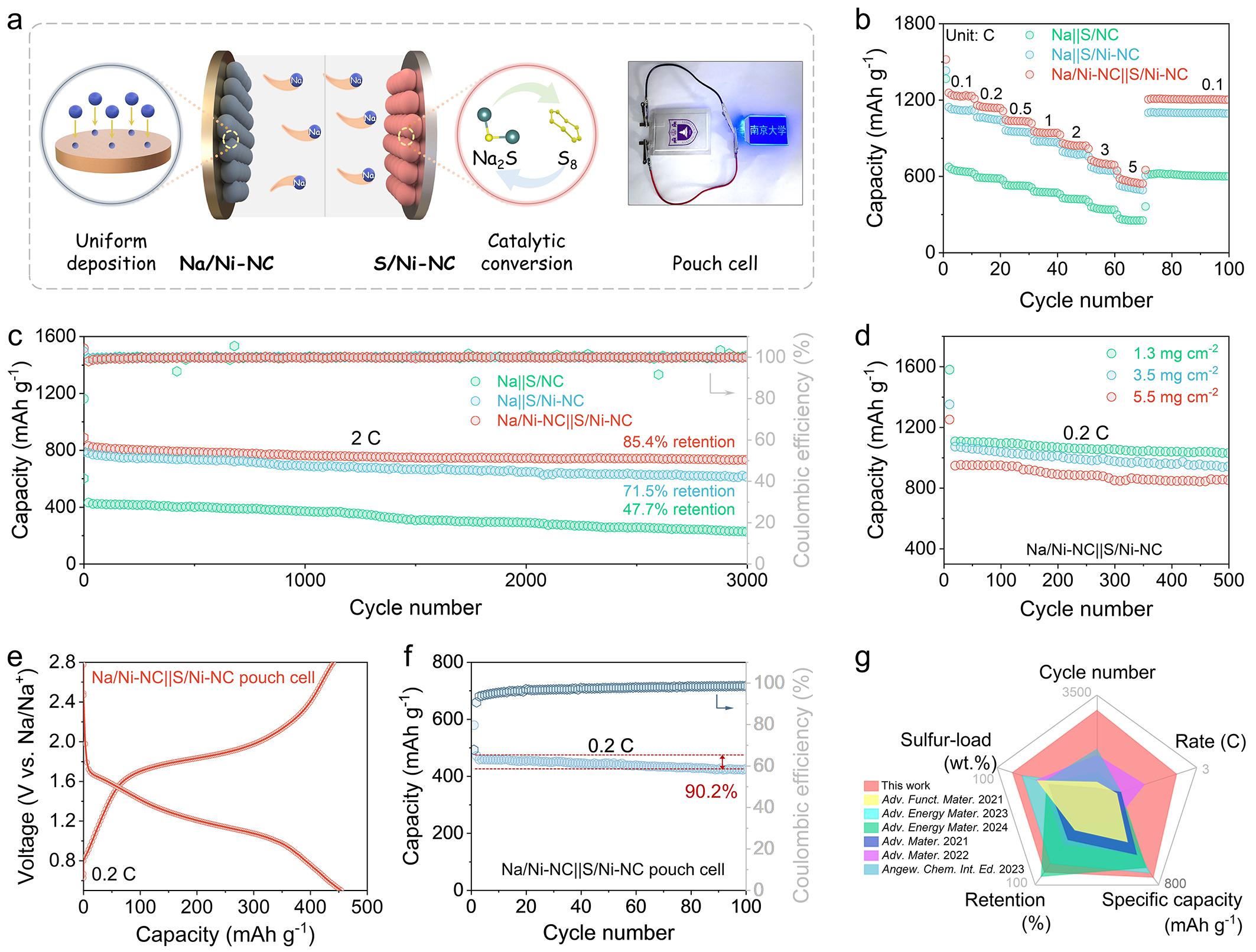 图6. Na/Ni-NC || S/Ni-NC全电池的性能。a) 组装的全电池示意图。b) 倍率性能。c) 长循环寿命。d) 不同硫载量正极的性能对比。e,f) 软包电池的恒电流充放电曲线及循环性能。g) 与相关研究报告的比较。