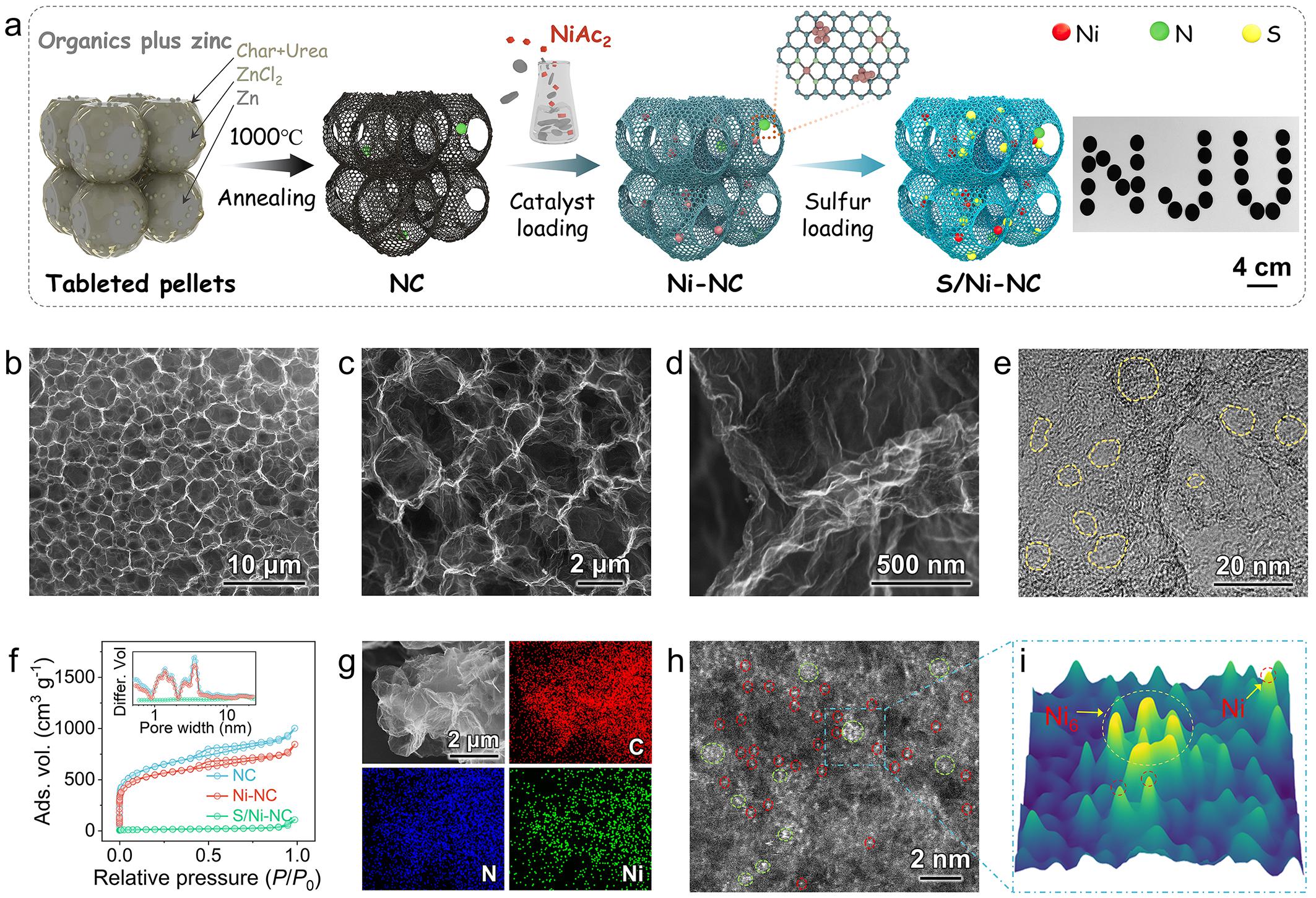 该研究依托团队长期从事的热裂解制碳技术,采用锌辅助热裂解法,以低成本、可回收的锌粉和氯化锌为造孔剂,构建了具有高比表面积(超过1900m2/g)和丰富微孔的氮掺杂多孔碳骨架(NC,图1)。该三维连通的多孔网络不仅为电子/离子传输提供了“高速公路”,也为硫的负载和充放电过程中的体积变化提供了充足的缓冲空间。借助球差校正电镜和X射线吸收光谱等先进表征技术,研究证实了材料中同时存在Ni单原子和Ni团簇,二者在多孔碳骨架上均匀分布(图2)。