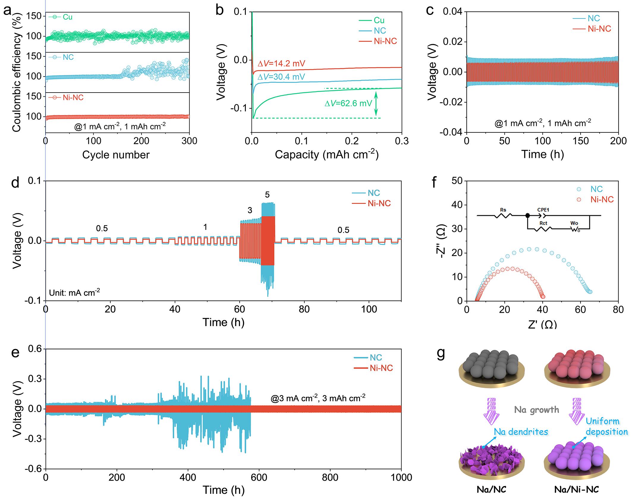 图5. Na/Ni-NC负极的电化学分析。a) 库伦效率。b) 电压曲线。c) 电压-时间曲线。d) 倍率性能。e) 长循环寿命。f) 奈奎斯特图。g) 钠金属沉积行为示意图。