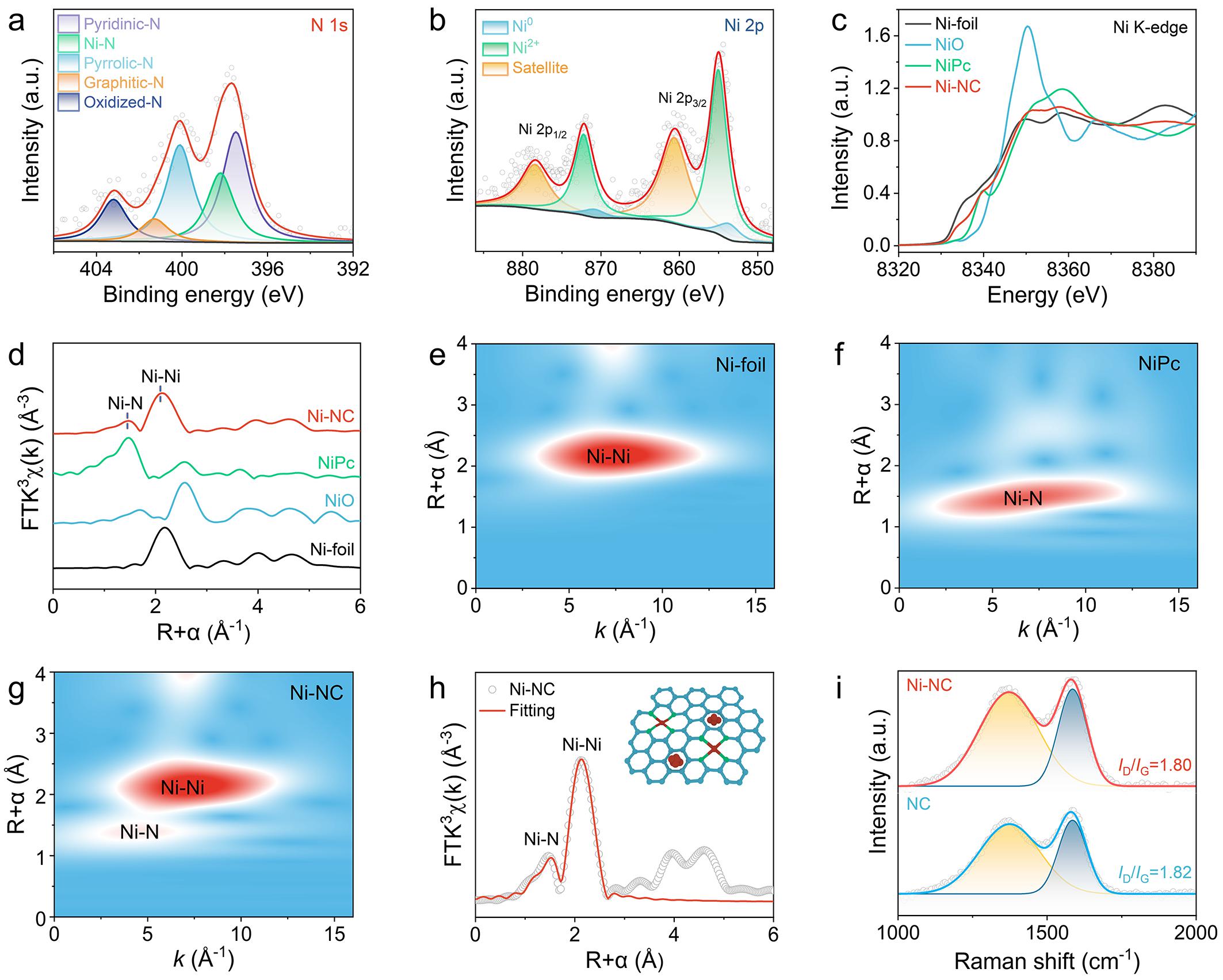 图2. Ni-NC的结构分析。a,b) N 1s和Ni 2p的XPS谱图。c,d) XANES谱和FT-EXAFS图。e-g) 小波变换EXAFS图。h) EXAFS拟合谱及Ni-NC构型示意图。i) 拉曼光谱。