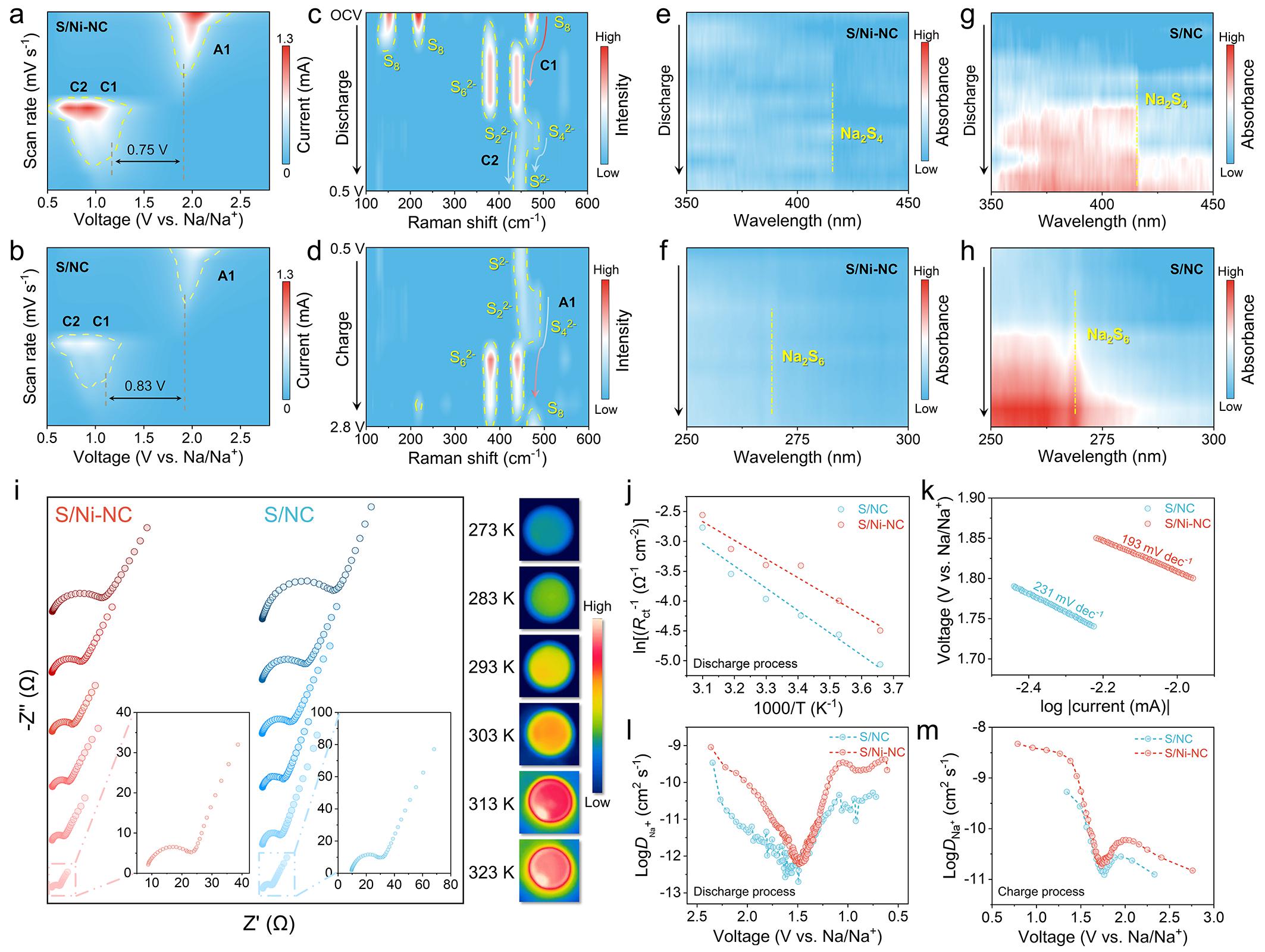 图3. S/Ni-NC正极的电化学分析。a,b) S/Ni-NC与S/NC的CV曲线等高线图。c,d) S/Ni-NC在放电和充电过程中的原位拉曼光谱。e-h) S/Ni-NC与S/NC在放电过程中电解液的原位紫外-可见光谱。i) 不同温度下的奈奎斯特图。j) Rct与温度的关联图。k) 塔菲尔图。l,m) 放电和充电过程的Na+化学扩散系数。