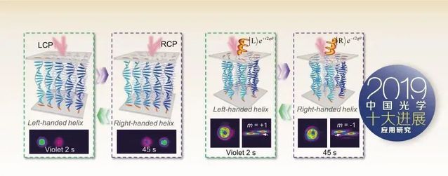 胡伟教授、陆延青教授团队通过设计掺入光控手性翻转分子机器的自组装螺旋超结构,实现了工作波段连续可调、共轭相位分布光控变换的平面光子元件,提供了一种动态平面光子元件的实用方案,入选2019年度中国光学十大进展应用研究类成果。