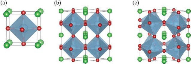 图1. CsPbI3若干理想结构。a) 理想立方Pm-3m相,b)完全有序四方P4/mbm相,c)完全有序正交Pnma相。